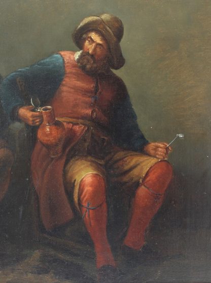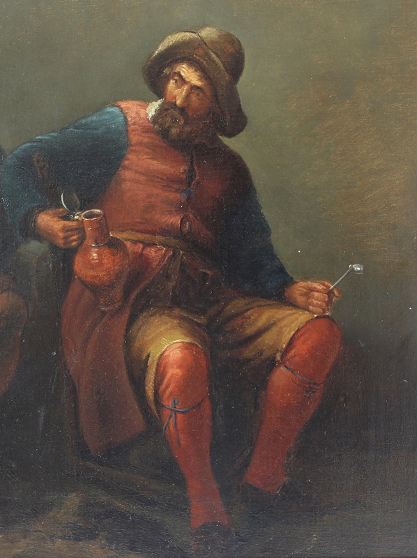 1610 Antwerpen -1690 Brüssel Umkreis oder Nachfolge. Eine Wirtshausszene. Öl auf Leinwand. Drei Männer sitzen um ein Fass, auf dem eine Glutschale steht, an welcher sich einer der drei seine Pfeife anzündet. Der zweite blickt griesgrämig in den leeren Raum, neben ihm auf der Bank liegt ein Stück Papier. Der dritte schaut sich das Geschehen zurückgelehnt auf seinem Stuhl an, in seiner Hand ein Krug. Es sind deutliche Übereinstimmungen mit Teniers in Physiognomie und Kleidung der Personen zu erkennen. Auch das Interieur, das Fass, die Glutschale und den Krug, findet man in anderen Gemälden von Teniers. Eine Blaulichtuntersuchung zeigt wenig Übermalungen. Größe ca. 43 x 57,5 cm, Rahmen ca. 60 x 76 cm. Wohl frühe Rentoilierung und spätere Wachsdoublierung aus dem 19. Jh. Minimal Craquelé.