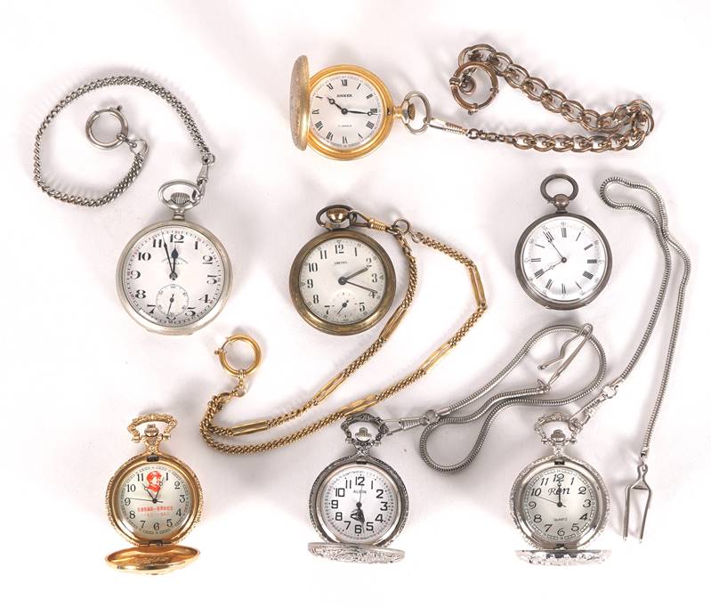Konvolut Taschenuhren Sieben diverse Taschenuhren u.a. zwei Quarzuhren, eine Schlüsseluhr, eine Eisenbahnuhr, eine Erinnerungsuhr Mao Tse Tung. Teils mit Kette. Funktion nicht geprüft. Bitte selbst besichtigen.