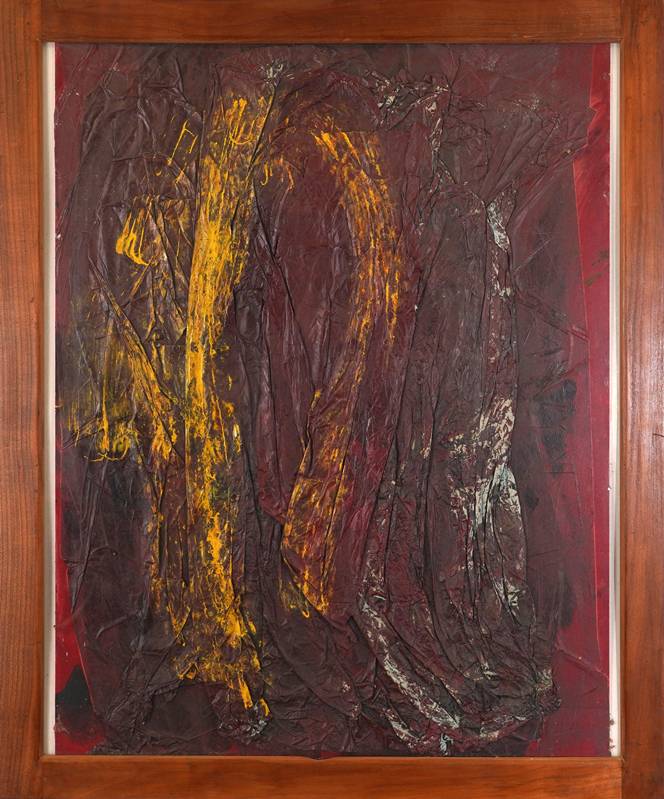 de Norso 1947 Freiburg im Breisgau - 2003. Abstrakte Komposition in Rot und Gelb. Mischtechnik auf gefaltetem Papier, auf Platte montiert. Hinter Glas gerahmt. Plattengröße ca. 67 x 50 cm, Rahmen ca. 73,5 x 60 cm. Das Werk stammt aus dem Nachlass des Künstlers.