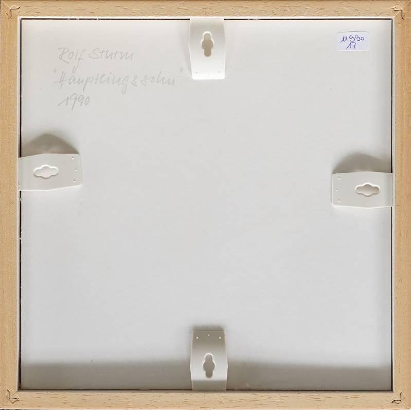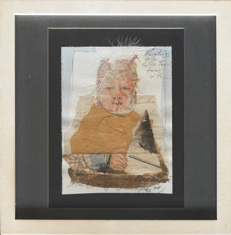 1939 Braunschweig - 2021 Berlin. "Häuptlingssohn little Tea-Face with...". Kollage. Oben rechts betitelt, unten links handsigniert und datiert (19)90, verso bezeichnet. Größe ca- 14 x 10,5 cm, hinter Glas und Passepartout gerahmt ca. 22 x 22 cm.