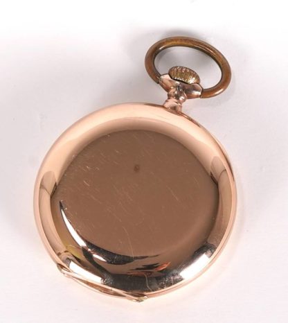 Taschenuhr Schaffhausen vor 1934. Gold 585 inklusive Staubdeckel punziert. Savonettetaschenuhr mit emailliertem Ziffernblatt mit arabischen Stundenzahlen und der Sekunde bei der Sechs. Vergoldetes Handaufzugsankerwerk mit verschraubten Chatons, Kompensationsunruhe, Breguet-Spirale und Feinregulierung. Auf dem Werk sowie den äußeren Deckeln Manufaktur Marke IWC Probus Scafusia, auf allen drei Deckeln Feingehaltspunze 0,585, Eichhörnchen mit B (Biel), Krone, sowie Werknummer 378539. Durchmesser ca. 5,5 cm. Gewicht ca. 115 Gramm. Läuft an.