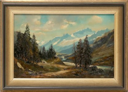 Unbekannter Künstler 20. Jh. Hochebene mit Personen und gewaltigem, schneebedecktem Gebirgsstock im Hintergrund. Öl auf Platte. Größe ca. 20 x 30 cm, Rahmen ca. 26 x 36 cm.