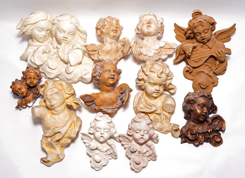 Deutsch 20. Jh. Konvolut von ca. 21 gegossenen Engeln aus diversen Materialien, in diversen Größen und Ausführungen. Aus dem Nachlass des Freiburger Künstlers Emil Ebner. Max. Größe ca. 22 x 12 cm, Höhe ca. 32 cm. Teils beschädigt. Bitte selbst besichtigen. Versand nicht möglich.