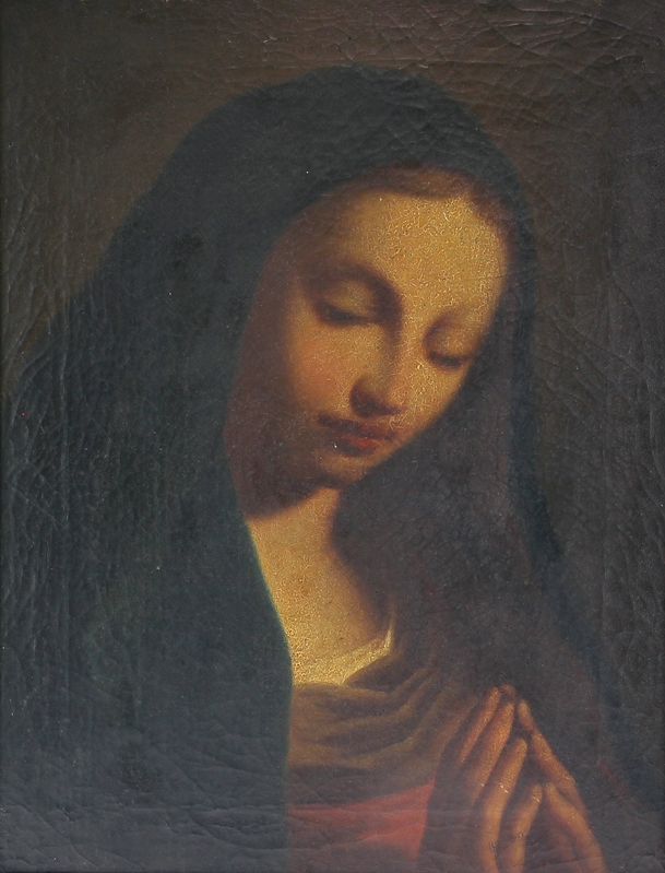 Betende Maria 1817. Maria im Gebet, die Hände gefaltet, die Lieder gesenkt. Öl auf Leinwand. Verso Monogramm ZEG, datiert 1817, nummeriert und Besitzvermerk Witterzoller. Größe ca. 46 x 36 cm, Rahmen ca. 58 x 47 cm. Craquelé, teils Farbverlust.