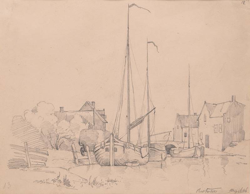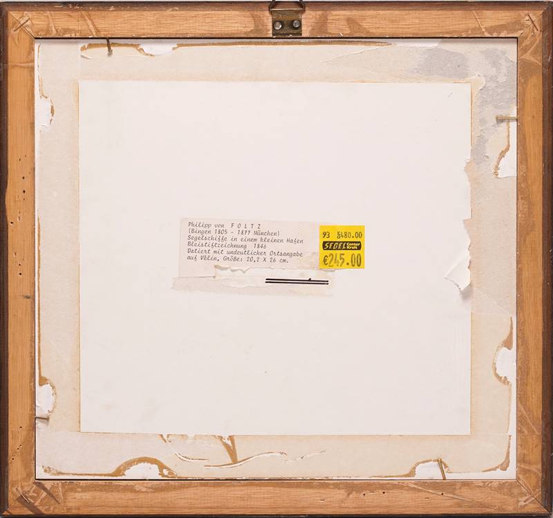 1805 Bingen - 1877 München. Zwei Bleistiftzeichnungen auf Papier. Ein Fischerboot im Hafen, unten rechts unleserlich bezeichnet und datiert (18)46, verso bezeichnet aus Familiennachlass und signiert. Ein weiteres Fischerboot im Hafen. Oben links unleserlich bezeichnet. Verso zweite Zeichnung zweier Personen sowie Signatur. Größe ca. 13,8 x 18,5 cm, hinter Passepartout montiert und Glas gerahmt ca. 33 x 35,5 cm.