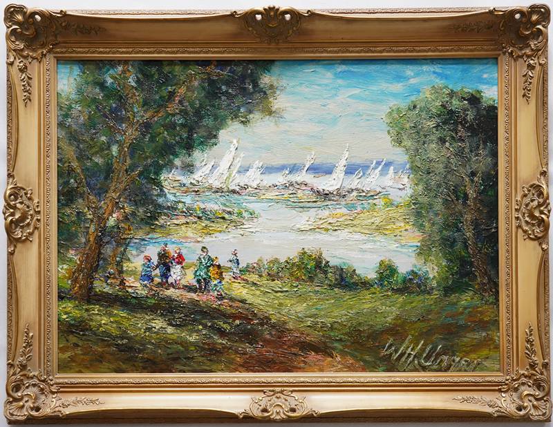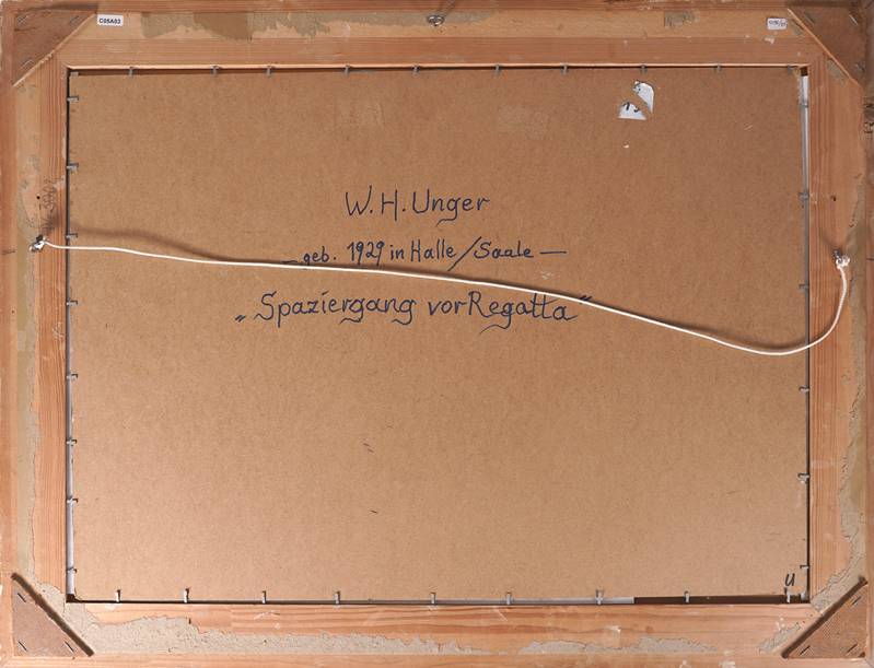 1929 Halle/Saale - 2019 München. "Spaziergang vor Regatta". Öl auf Platte. Unten rechts signiert. Verso bezeichnet. Größe ca. 50 x 70 cm, Rahmen ca. 64 x 74 cm.