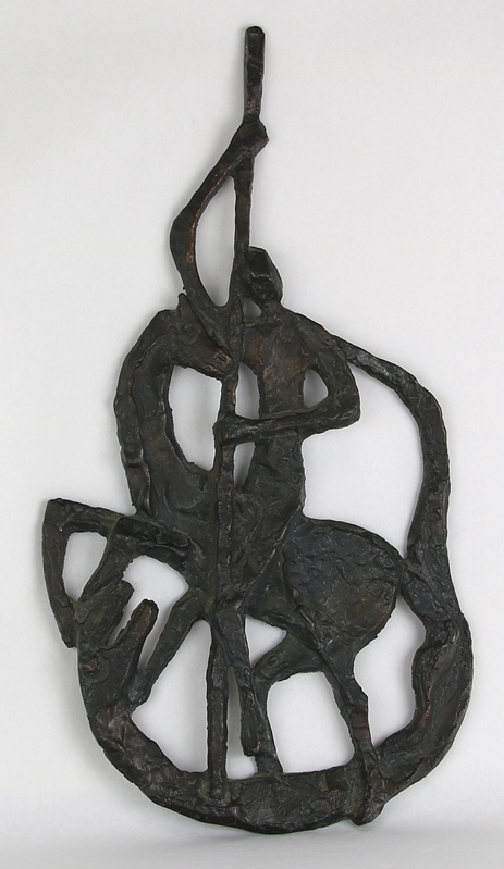 Bernhard Waldkircher Künstler um 1972. St. Georg zu Pferde, den Drachen tötend. Bezeichnet Bernhard und datiert (19)72. Größe ca. 33,5 x 17,5 cm, Gewicht ca. 1,4 Kilogramm.