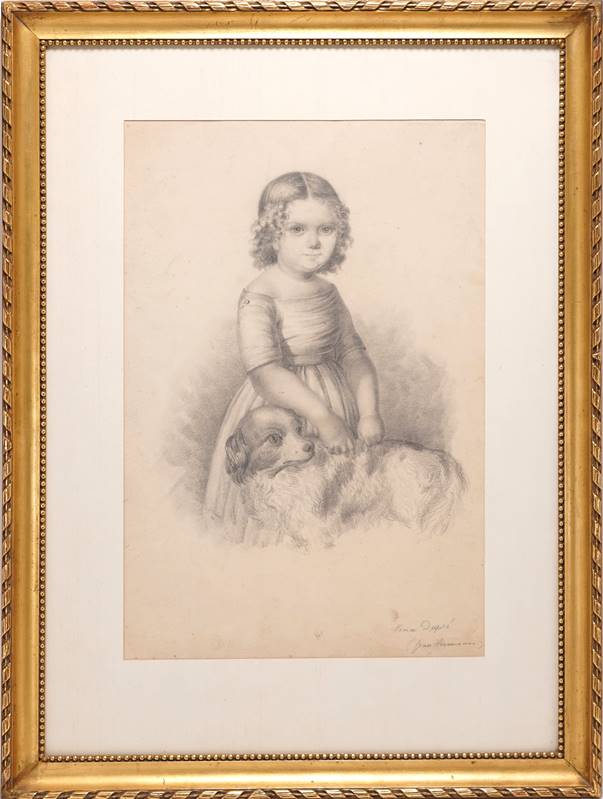 1807 Brandenburg - 1875 Berlin attr. Mädchen mit Hund. Bleistiftzeichnung auf Papier. Unten rechts bezeichnet ? Hosemann und Name der Dargestellten Mina Dupré. Größe ca. 43 x 28 cm, hinter Passepartout und Glas gerahmt ca. 63 x 47 cm.