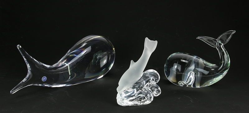 Konvolut Glasfiguren Skandinavien 20. Jh. Zwei Wale und ein mattierter Delfin. Unter dem Boden eines Wales eine Signatur. Größe des größten Wals ca. 5 x 26 cm, Höhe ca. 11 cm. Guter Zustand.