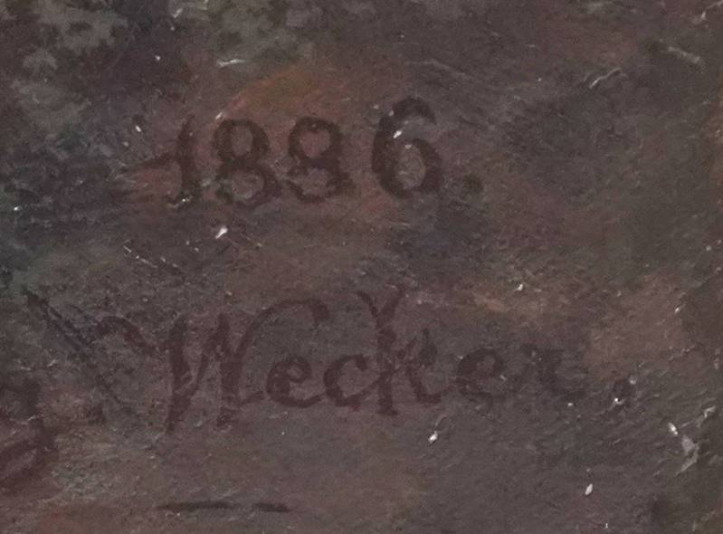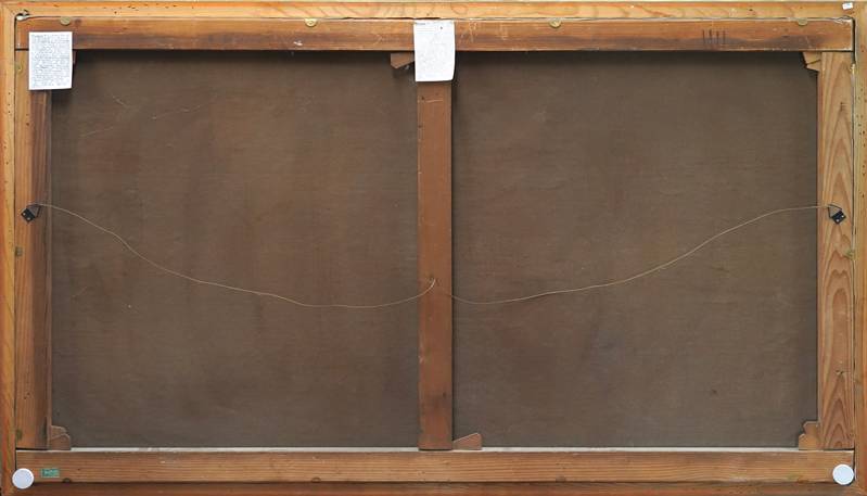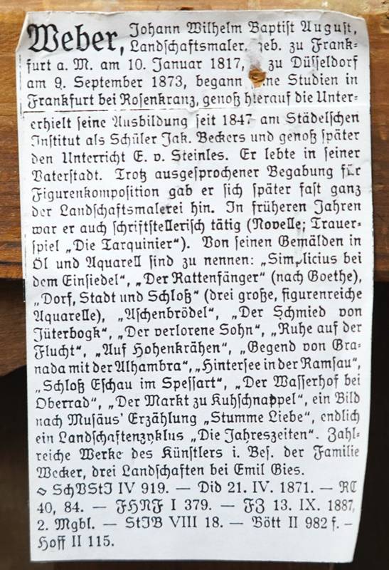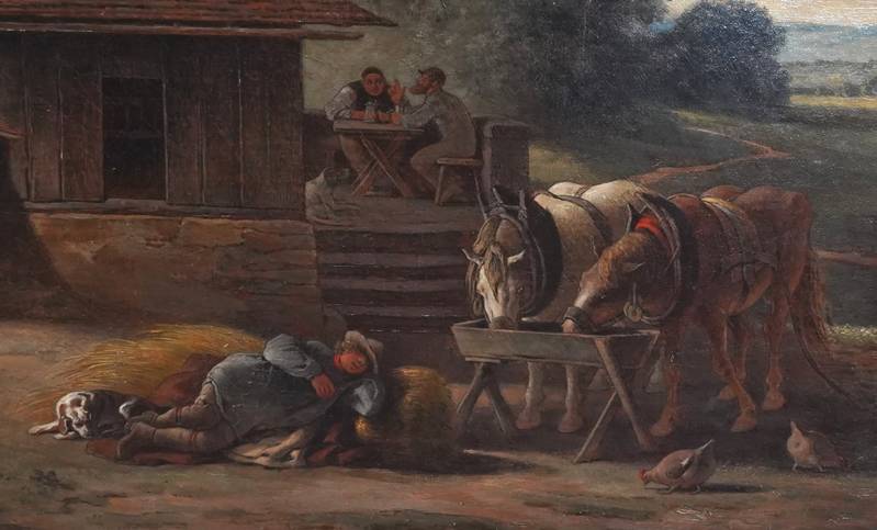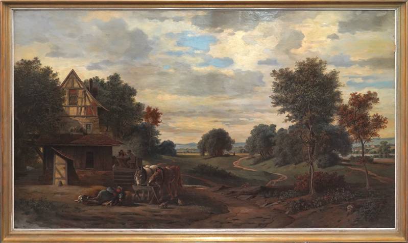 1831 Frankfurt a. M. - 1887 ebd. Mittagsruhe. Großformatiges Landschaftsbild mit weitem Blick in die Ebene auf der rechten Seite, links mit Bauernhaus, einem Pferdegespann an der Tränke und einem schlafenden Bauern. Öl auf Leinwand. Unten rechts signiert und datiert 1886. Größe ca. 90 x 154 cm, Rahmen ca. 98 x 165 cm. Teils Craquelé und Farbverlust. Kein Versand möglich, wir empfehlen gerne eine Spedition.