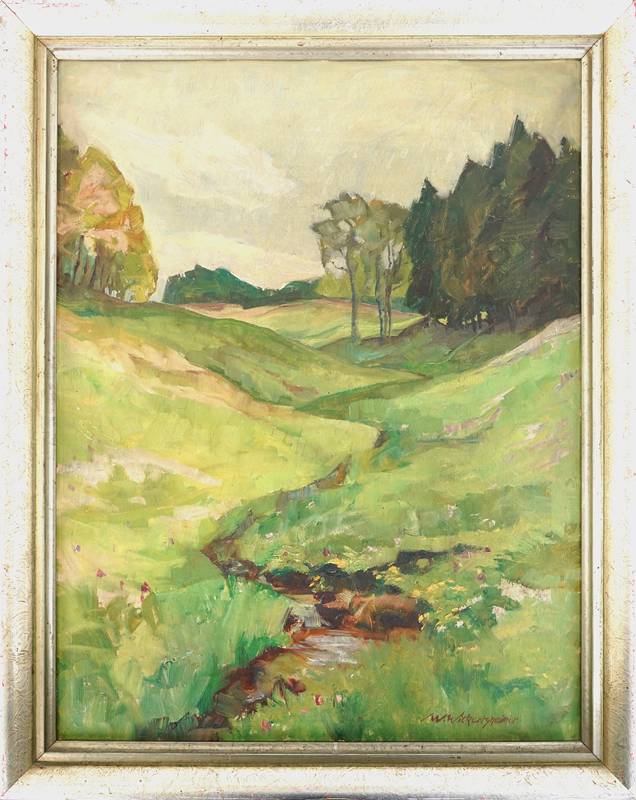 1886 Lahr im Schwarzwald - 1968 ebd. "Wiesenbächlein im Frühling (Grisberg)". Öl auf Platten. Unten rechts signiert, verso nummeriert 1122, betitelt, bezeichnet "Lahr" und datiert 1937. Größe ca. 68 x 52 cm, Rahmen ca. 75 x 60 cm.
