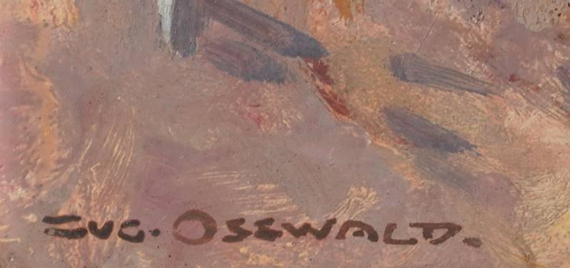 Osswald, Eugen 1879 Stuttgart - 1960 München. Pferderennen, Traber mit Sulkys. Öl auf Platte. Unten links signiert. Größe ca. 40 x 50 cm, Rahmen ca. 50 x 60 cm.