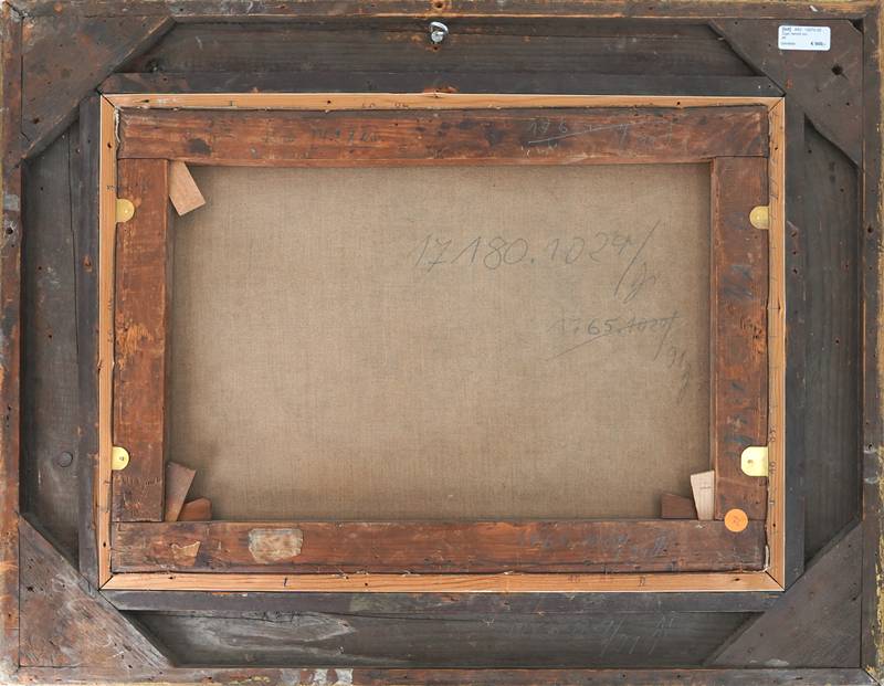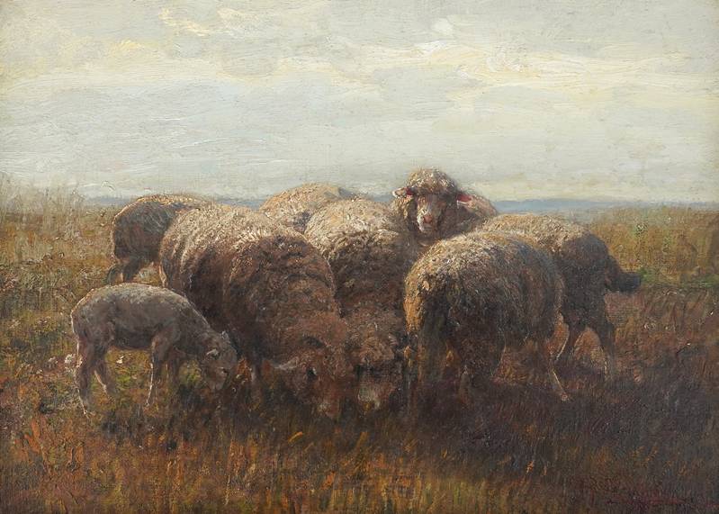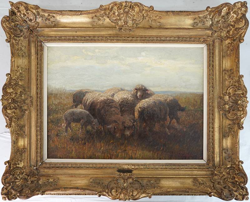 1850 Murrhardt - 1941 München. Schafe auf der Weide. Öl auf Leinwand. Unten rechts schwer leserlich signiert, auf dem Rahmen bezeichnet, verso divers nummeriert. Größe ca. 41 x 57 cm, Rahmen ca. 63 x 78 cm.