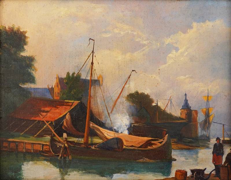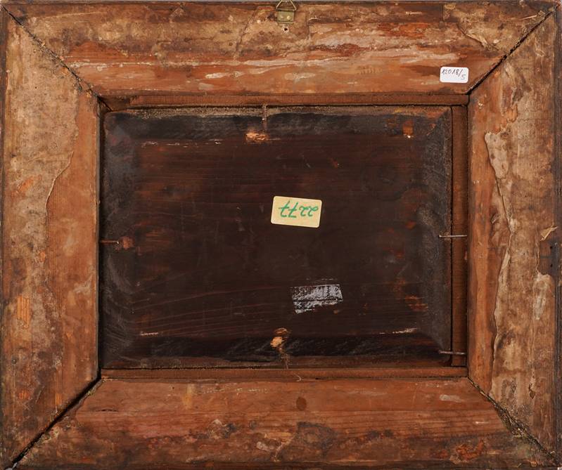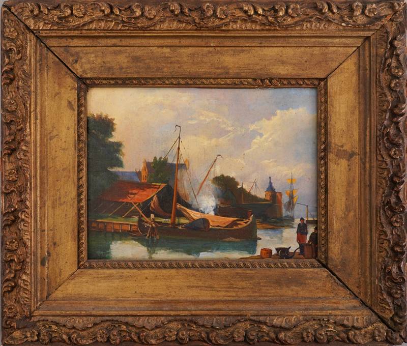 Ungarn um 1900. Öl auf Holz. Boote in einem Seehafen. Verso ungarischer Ausfuhrstempel, genehmigt von der Ungarischen Nationalgalerie: "Kivitelre Engedelyezve MNG". Größe ca. 16,8 cm x 22 cm, Rahmen ca.30 x 35,5 cm. Teils minimal fleckig.