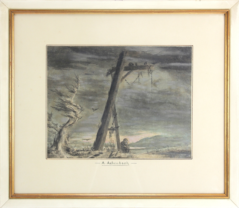 1815 Kassel - 1910 Düsseldorf. Ein Galgen in einer trostlosen Landschaft, an dessen Fuß eine Gestalt kauert. Gouache auf Papier. Unten rechts monogrammiert, unter dem Bild und verso bezeichnet. Größe des Blattes ca. 17,5 x 22,5 cm, Rahmen ca. 33 x 38 cm. Guter Zustand,