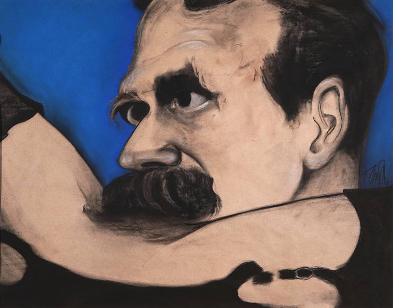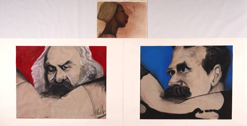 20. Jh. Drei Pastellzeichnungen mit Kohle und Weißhöhungen. Einmal Marx und einmal Nietzsche beim Cunnilingus sowie ein Portrait einer jungen Frau. Je signiert. Zweimal hinter Passepartout montiert. Maximale Größe ca. 70 x 100 cm.