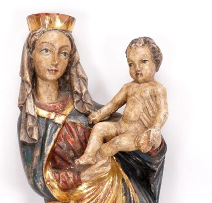 Gotische Madonna 17./18. Jh. Madonna mit Kind auf Wandsockel. Holz, vollrund geschnitzt, polychrom und goldstaffiert. Größe ca. 14 x 10 cm, Höhe ca. 63 cm. Teils etwas bestoßen und berieben.