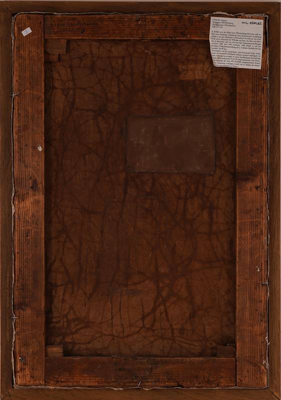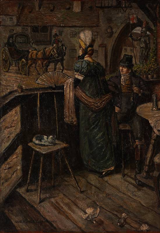 Kühles, August 1859 Würzburg - 1926 München. Öl auf Leinwand. Ein vornehmes Paar erwartet die herannahende Postkutsche. Signatur und Ort unten links Aug. Kühles. München. Verso Sammleretikett. Größe ca. 70 x 50 cm, Rahmen ca. 76,5 x 55 cm. Teils starkes Craquelé.