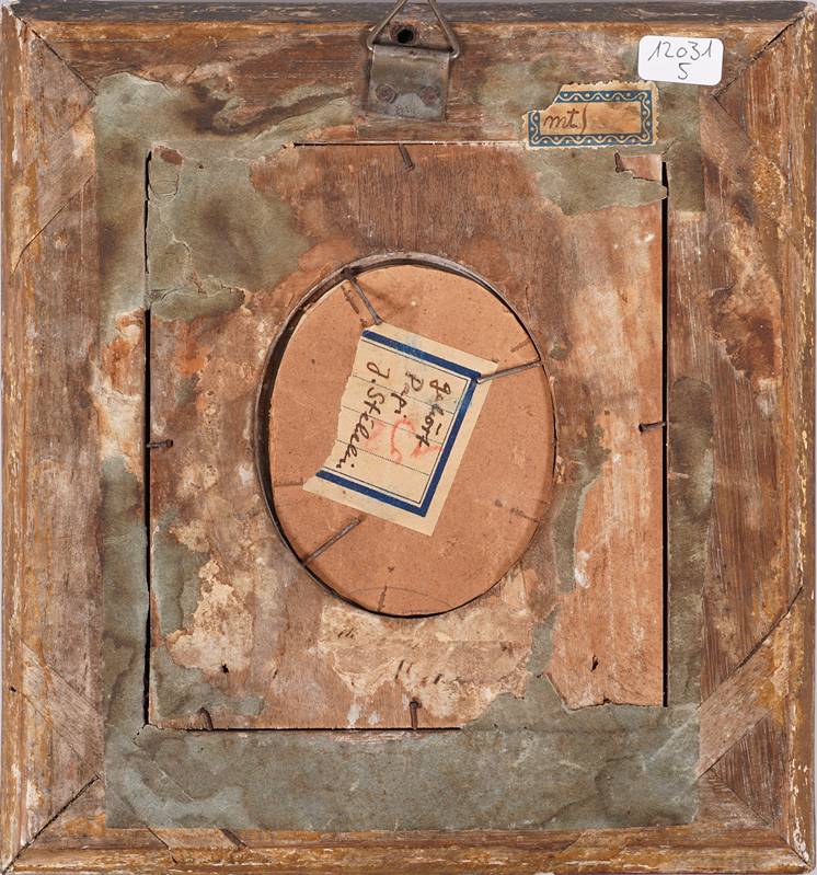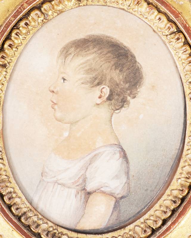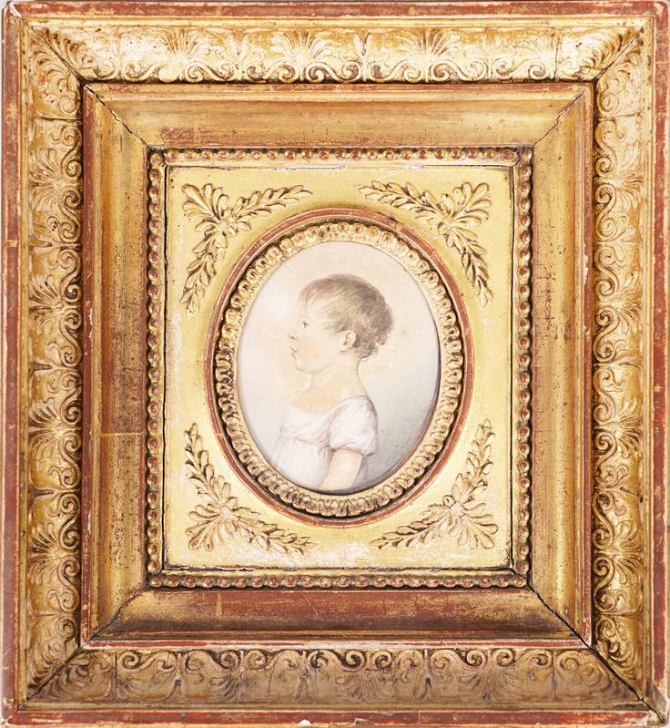 19. Jh. Porträt eines Kindes. Aquarell auf Karton. Verso bezeichnet. Größe ca. 7,5 x 6 cm, hinter Glas gerahmt ca. 19,5 x 18 cm.