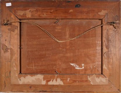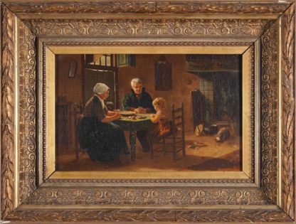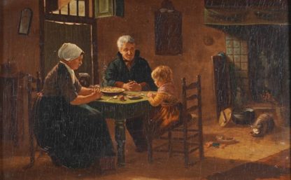 Wohl 19. Jh. Großeltern und Enkel beim Tischgebet. Öl auf Holz. 18 x 27 cm, Rahmen ca. 31 x 41 cm. Minimaler Farbverlust.