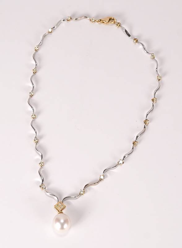 Brillantcollier mit Perle Gelb- und Weißgold 750. Wellenförmige Kettenglieder verbunden mit je einem champagnerfarbenen Brillanten in Krappenfassung, insgesamt 20 Stück, jeweils ca. 0,1 Carat. Zentrales Element bestehend aus Raute mit vier Brillanten, insgesamt ca. 0,08 Carat, daran eine große Barockperle, Größe ca. 14 x 16 mm. An der Raute unleserlich punziert, geprüft. Länge ca. 43 cm, Gewicht ca. 24,06 Gramm.