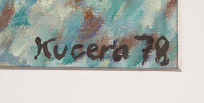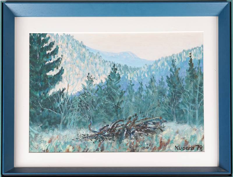 Maler des 20. Jh´s. Öl auf Hartfaserplatte. Ansicht von bewaldeten Bergen. Unten rechts signiert und datiert "Kucera 78". Größe ca. 39 x 50 cm, Rahmen ca. 44,5 x 55,8 cm.