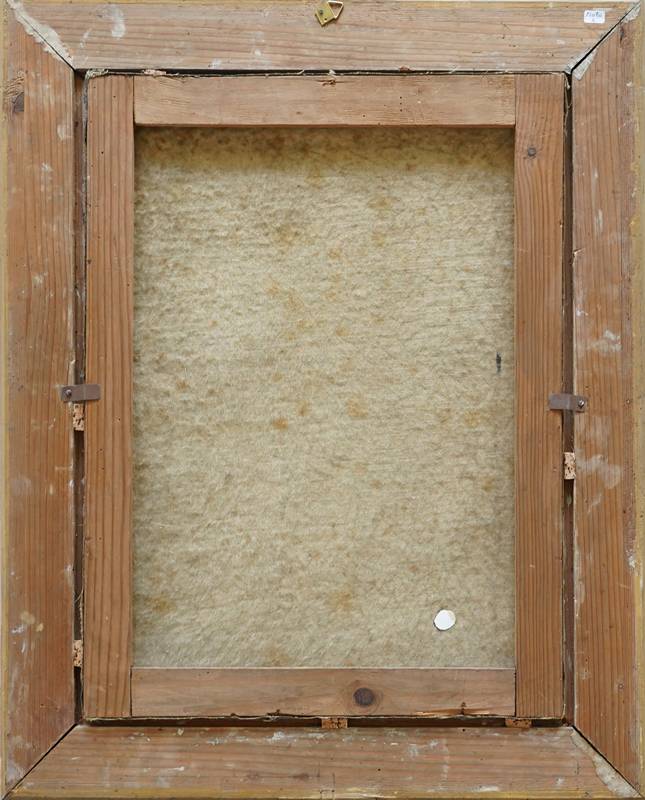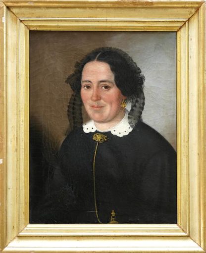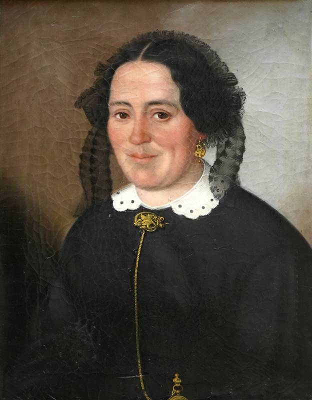 Deutsch frühes 19. Jh. Portrait einer Dame mit schwarzer Haube und Taschenuhr an Brosche. Öl auf Leinwand. Größe ca. 55 x 41 cm, Rahmen (beschädigt) ca. 68 x 56 cm. Teils doubliert, Craquelé.