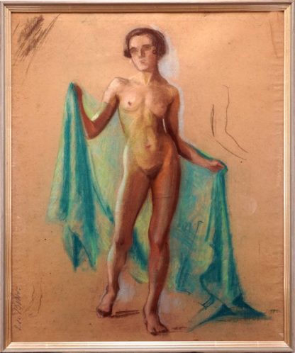Weiblicher Akt Um 1900. Stehender weiblicher Akt mit grünem Tuch. Mischtechnik auf Papier. Unten links signiert E. v. Behr. Größe ca. 73 x 60 cm, hinter Glas gerahmt ca. 77 x 64 cm.