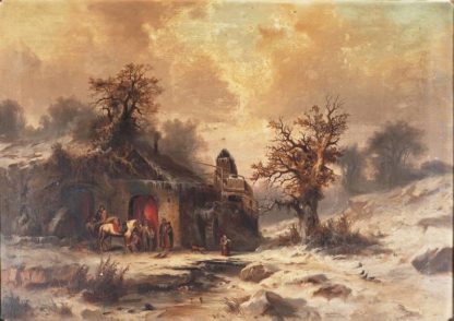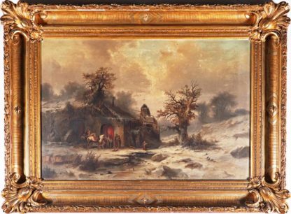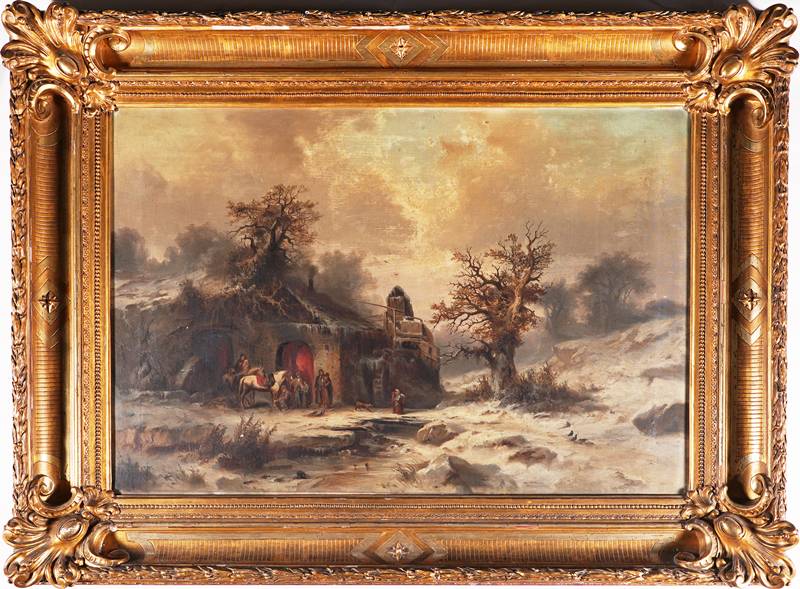 Wohl Berliner Maler um 1815. Rast in Winterlandschaft. Öl auf Leinwand. Größe ca. 69 x 98 cm, in prunkvollem Rahmen ca. 97 x 127 cm. Teils mit Farbverlust. Laut Einlieferer handelt es sich hier um den Rückzug der französischen Armee nach der Schlacht um Moskau. Kein Versand möglich, wir empfehlen gerne eine Spedition.