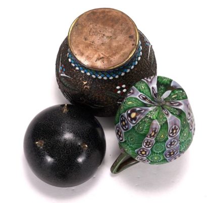 Japan und wohl Tibet um 1900. Cloisonné-Arbeit. Einmal Bauchiger Korpus auf drei kleinen Standfüßen, Deckel mit Knauf. Farbenprächtiger Blütendekor. Größe ca. 7 x 7 cm, Höhe ca. 9 cm. Einmal Bauchiger Korpus, sich nach unten verjüngend mit Deckel. Größe ca. 10,5 x 10,5 cm, Höhe ca. 12 cm. Am unteren Fußrand etwas best. Dazu ein Glasvase mit zwei Henkeln. Mit mit eingeschmolzenen mehrfarbigen Blumendekor.