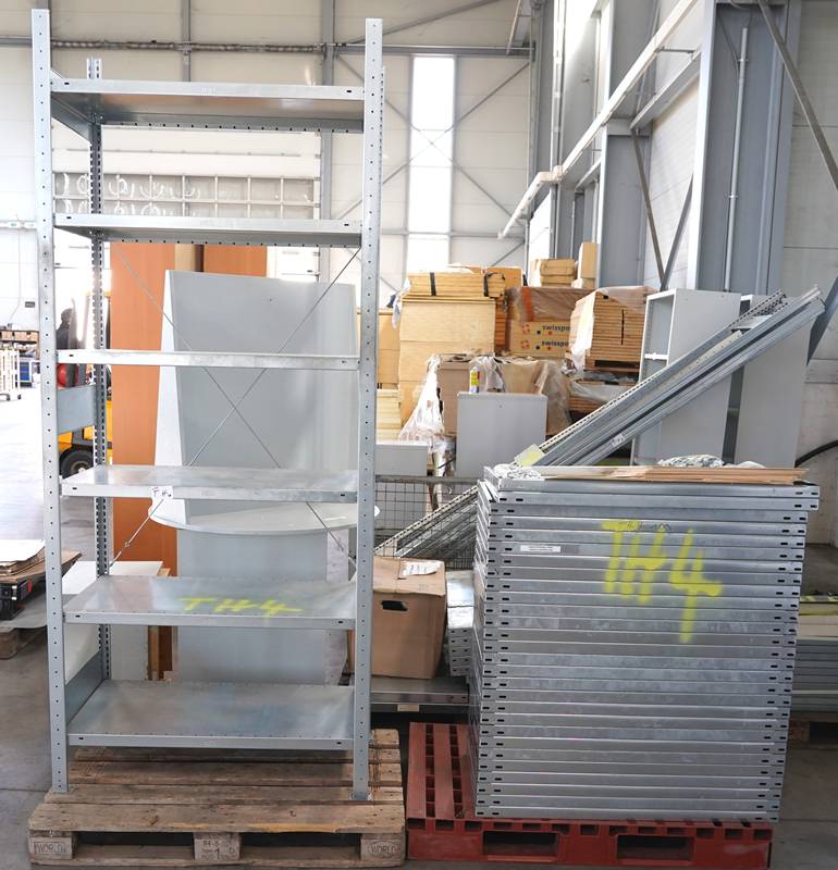 Metallregal mit Einlegeböden. Meta und eine Palette zusätzliche Böden.