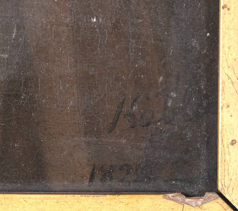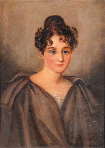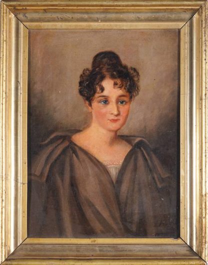 19. Jh. Portrait einer jungen Frau. Öl auf Leinwand. Unten rechts signiert und datiert, wohl "Küble" 1828. Größe ca. 32 x 24 cm, Rahmen ca. 40 x 31 cm. Die Leinwand ist teils doubliert, auf Höhe des linken Auges.