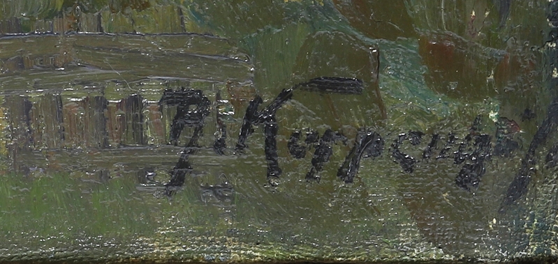Anonymer Künstler A. Kuppenb... signierend. Schwarzwaldlandschaft mit Dorfkirche in der Umgebung von Ettlingen. Öl auf Leinwand. Unten rechts signiert. Größe ca. 49,5 x 37,5 cm, Rahmen ca. 70 x 57 cm.