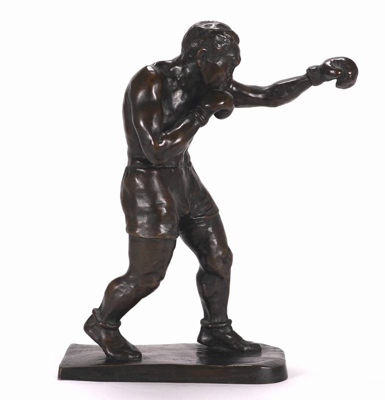 Boxer Skulptur Deutsch 1930-er Jahre. Bronze auf Bronzesockel montiert. Naturalistische Darstellung eines Boxers mit ausgelegter Linken. Größe ca. 30 x 10 cm, Höhe ca. 34 cm, Gewicht ca. 6,2 Kilogramm.