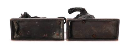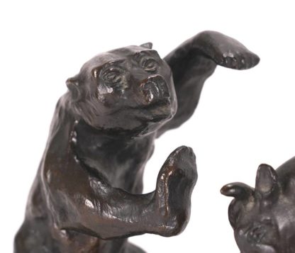 20. Jh. Bronze. Bulle und Bär. Symbolisieren Bullen- und Bärenmarkt an der Börse. Dabei steht der Bulle an der Börse für anhaltend steigende Börsenkurse, der Bär hingegen für anhaltend sinkende Kurse. Größe Bulle ca. 16,5 x 7 cm, Höhe ca. 14 cm. Gesamtgewicht ca. 6,3 kg.