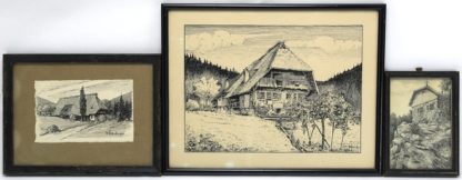 Straub, Georg 1882 Wolfach - 1959. Drei Federzeichnungen auf Papier. Schwarzwaldthemen. Jeweils unten signiert, teils datiert (19)26, (19)29. Größte Zeichnung ca. 18 x 25 cm, hinter Glas gerahmt ca. 24 x 31 cm. Guter Zustand.