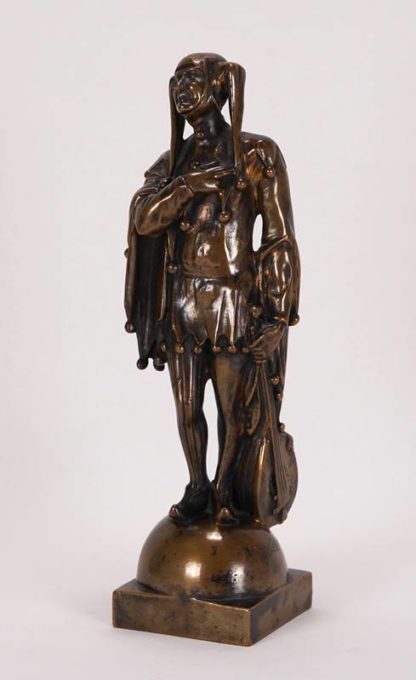 Till Eulenspiegel 20. Jh. Metallfigur eines Narren. Stehend auf einer Halbkugel, auf quadratischer Plinthe, mit Mandoline. Signatur des Künstlers auf der Kugel W. Klein. Größe ca. 8 x 7 cm, Höhe ca. 16 cm, Gewicht ca. 2,1 kg.
