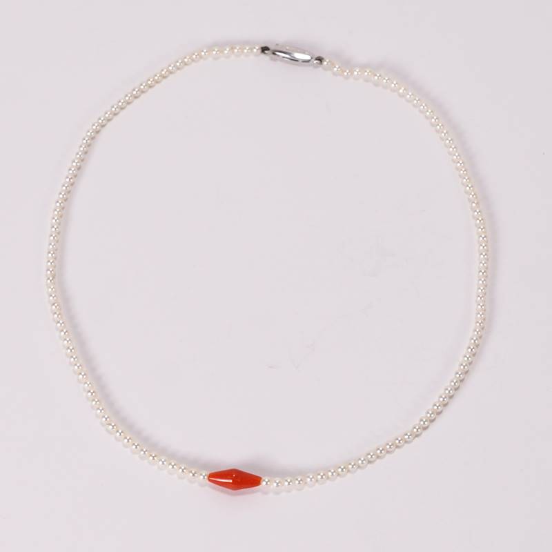 Feine Perlenkette Verschluss 585 Weißgold, punziert mit Herstellerpunze J. Köhle GmbH & Co. KG. Feine Perlen mit Korallenelement von Gellner. Länge ca. 40 cm, Gewicht ca. 4,7 Gramm. Anbei ehemaliges Verkaufsetikett mit Bezeichnung.