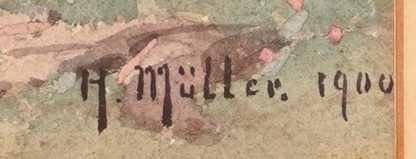 Deutscher Landschafter. Partie wohl am Bodensee. Mischtechnik auf Papier. Unten rechts signiert und datiert 1900. Größe ca. 37 x 49 cm, hinter Passepartout und Glas gerahmt ca. 49 x 59 cm.