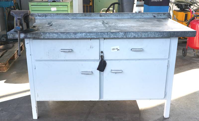 Werkbank mit Schraubstock, ohne Inhalt.