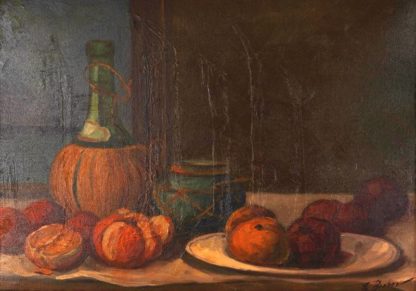 Stillleben 20. Jh. Stillleben mit Früchten und Ausblick auf das Meer. Öl auf Platte. Unten rechts signiert. Größe ca. 40 x 53 cm, in kapitalem Rahmen ca. 60 x 73 cm.