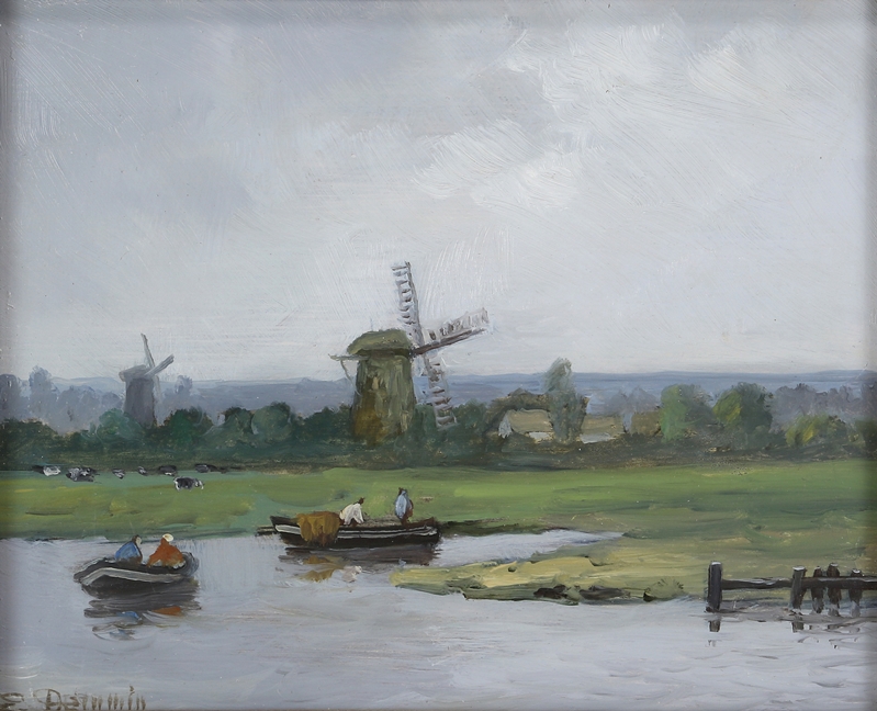Demmin, Erich 1911 Ivenack - 1997 Berlin. Holländische Landschaft mit Windmühlen. Öl auf Holz. Unten links signiert. Größe ca. 14 x 17 cm, kapitaler Rahmen ca. 28 x 31 cm. Guter Zustand.