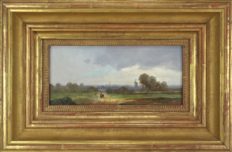 Demmin, Erich 1911 Ivenack - 1997 Berlin. Holländische Landschaft unter wolkenverhangenem Himmel. Öl auf Holz. Unten links signiert. Größe ca. 11 x 24,5 cm, kapitaler Rahmen ca. 25,5 x 29,5 cm. Guter Zustand.