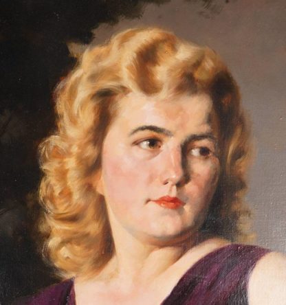 1880 Frankfurt am Main - 1936 München. Öl auf Leinwand. Portrait einer schönen jungen Frau in einem violetten Abendkleid. Sitzend vor einer Landschaft und eine zarte Blume haltend. Signatur und Datum unten rechts (19)32. Verso Sammleretikett. Größe ca. 106 x 80 cm, Rahmen ca. 112 x 85 cm. Craquelé.