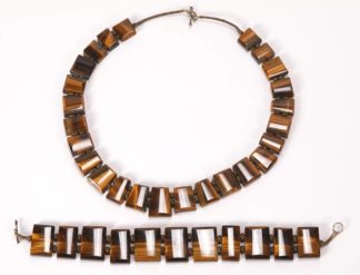 Gold 585/14 Karat. Ein Paar Hängeohrringe mit Feingehaltspunze 14 K auf dem Verschluss, eine Kette mit Anhänger mit Feingehaltspunze 14 K auf dem Kettenverschluss, ein Armand mit Feingehaltspunze 14 K auf dem Verschluss. Teile des Sets jeweils mit viereckigen Steinen in Blau und Bernsteinfarben besetzt. Länge der Kette ca. 44 cm, Länge des Armbands ca. 21 cm. Gesamtgewicht ca. 42 Gramm.