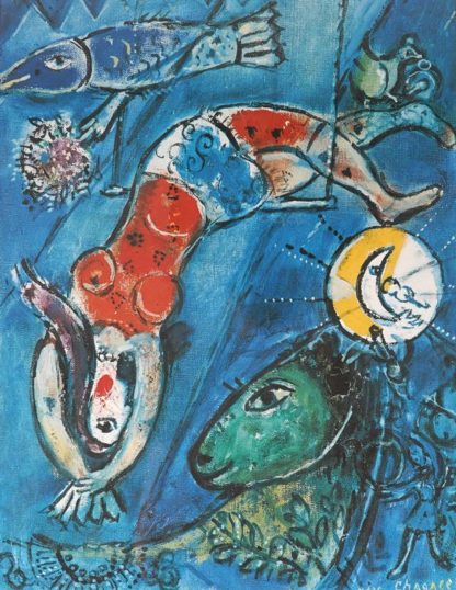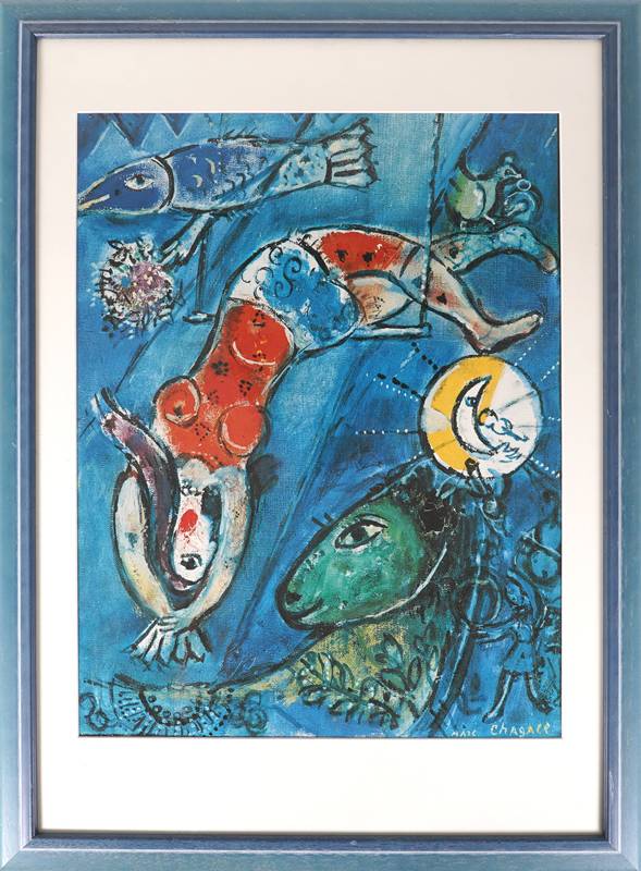 Chagall, Marc 1887 Witebsk - 1985 Saint-Paul-de-Vence, nach. "Blauer Zirkus". Farboffset, hinter Glas und Passepartout gerahmt. Im Druck unten rechts signiert. Unten rechts typografisch bezeichnet "Blauer Zirkus 1950/52 VG Bild-Kunst, Bonn 2003". Unten links typografisch bezeichnet "Marc Chagall". Blattgröße ca. 60 x 45,5 cm, Rahmen ca. 77 x 57 cm.