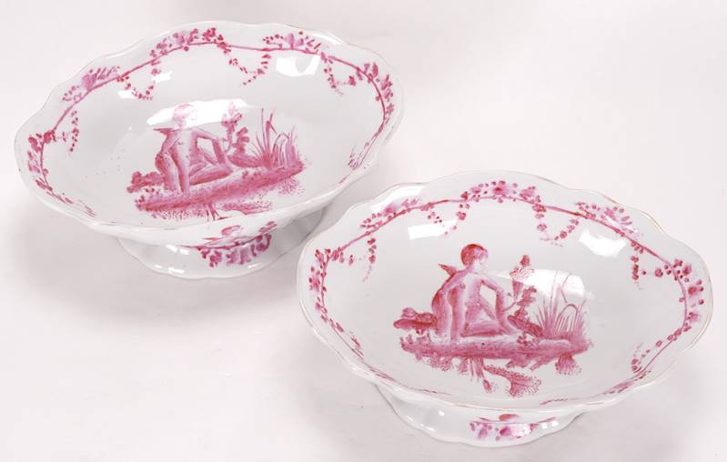 China 1970er. Hua Ping Manufaktur. Porzellan, Famille Rose. Insgesamt 6 Teile. Je zwei Fußschalen, Deckelschalen und Tassen. Jeweils mit einem kleinen Amor an einem Gewässer und mit Blumengirlanden. Unter dem Boden jeweils mit Marke. Max. Größe ca. 25 x 16,5 cm, Höhe ca. 10,5 cm. Zustand wie abgebildet.