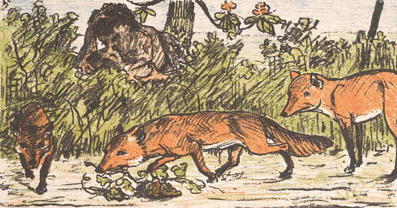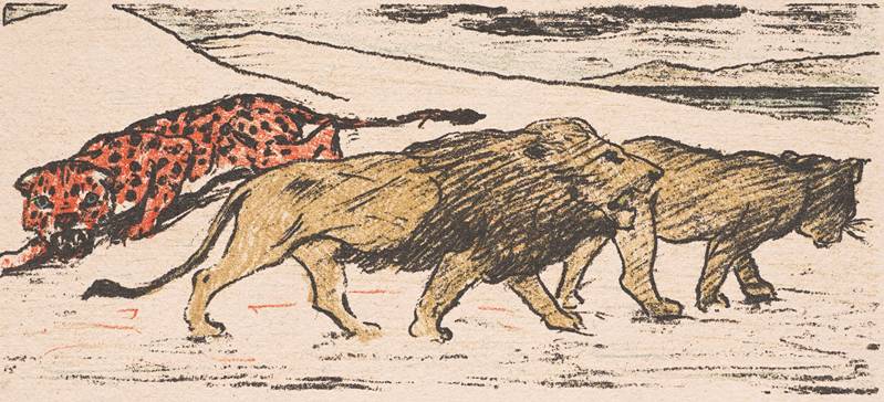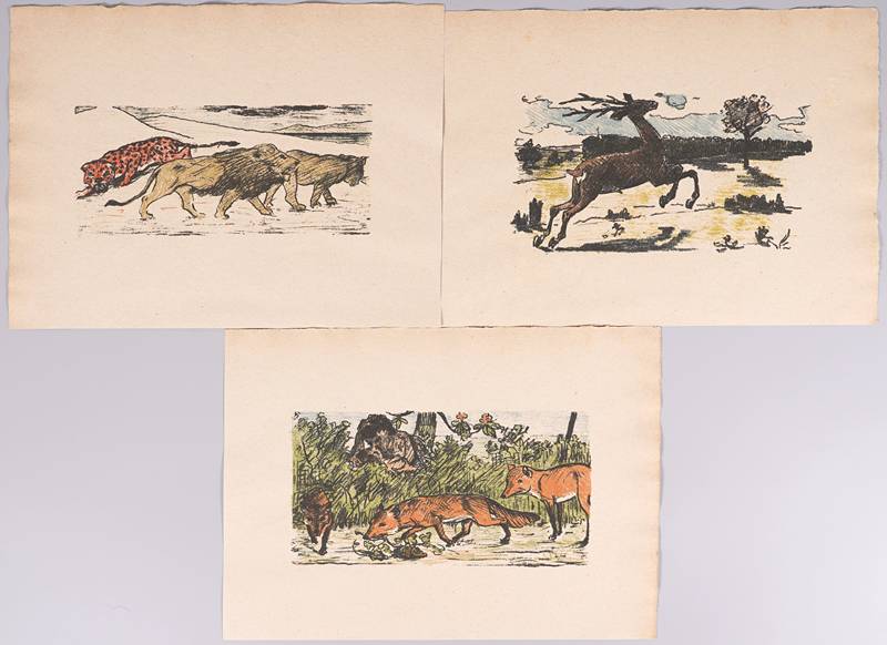 Corinth, Lovis 1858 Tapiau - 1925 Zandvoort, nach. Drei alte Lichtdrucke auf Bütten: Zwei Löwen, Springender Hirsch, Drei Füchse. Bildgrößen ca. 10/12/12 x 23/23/23 cm, Blattgröße je ca. 25 x 33 cm.