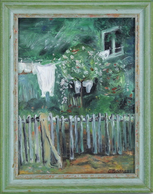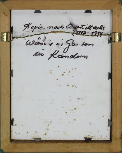 Backhaus, Christel Nach August Macke. Wäsche im Garten in Kandern. Öl auf Platte. Unten rechts signiert. Größe ca. 18,5 x 14,5 cm, Rahmen ca. 21,5 x 17,5 cm. Guter Zustand.