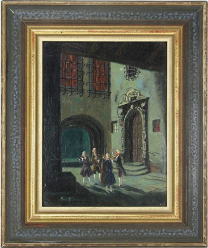 Hildebrand, Emil * 1930. Münchner Maler. Vier Musikanten in einem barocken Innenhof bei Mondlicht. Öl auf Holz. Unten links signiert und bezeichnet München. Größe ca. 18,5 x 13,5 cm, Rahmen ca. 26,5 x 22,5 cm.